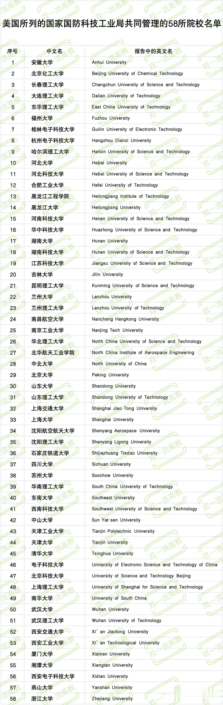 以下是这 58 所中国大学的完整名单(来自报告中的英文本名 + 中文译名):